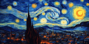 Salah satu karya yang paling terkenal adalah The Starry Night (1889), yang dilukis ketika ia berada di rumah sakit jiwa di Saint-Rémy. Lukisan ini menampilkan langit malam berputar dengan bintang-bintang terang yang berkilauan, dilatarbelakangi desa kecil yang tenang. Melalui sapuan kuas berputar dan warna kontras biru serta kuning, Van Gogh menciptakan suasana yang dramatis sekaligus emosional. Lukisan ini hingga kini dianggap simbol dari pencarian spiritual dan pergulatan batin sang seniman.